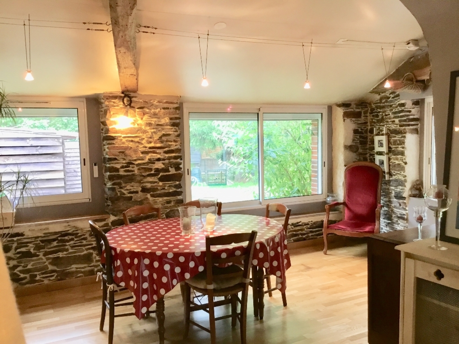 Longère en pierres et poutres apparentes entièrement rénovée située en plein bourg de GESTE comprenant : - Au rez-de-chaussée : grande pièce de vie sur parquet avec poêle à bois et cuisine aménagée, chambre sur parquet avec dressing, wc, salle de bain (douche et baignoire). - A l'étage : 2 chambres belle hauteur sous plafonds. Jardin arboré de 800 m², clos et sans vis à vis.